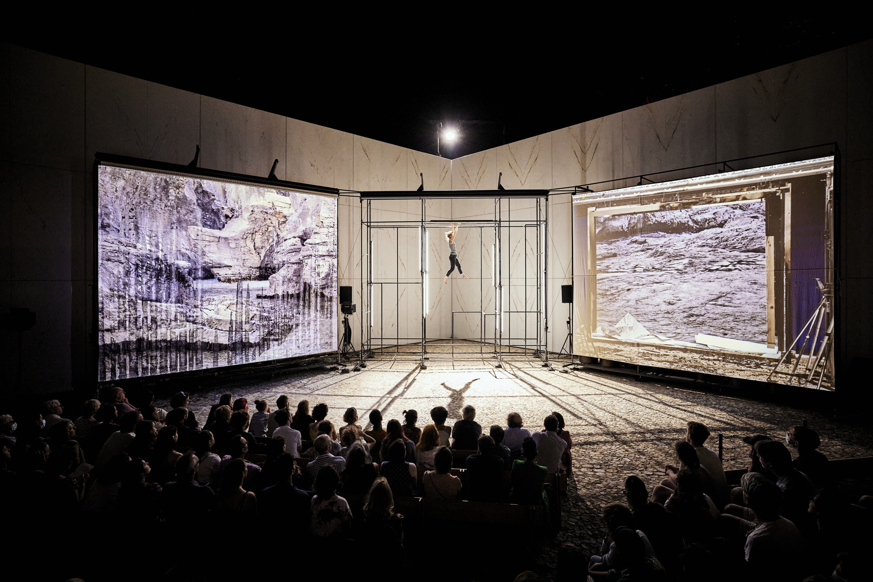 The piece comprises photographic and film interventions by Goudal with music by composer Chloé Thévenin and a live performance by Chloé Moglia, whose research focuses on the concept of suspension and weightlessness.