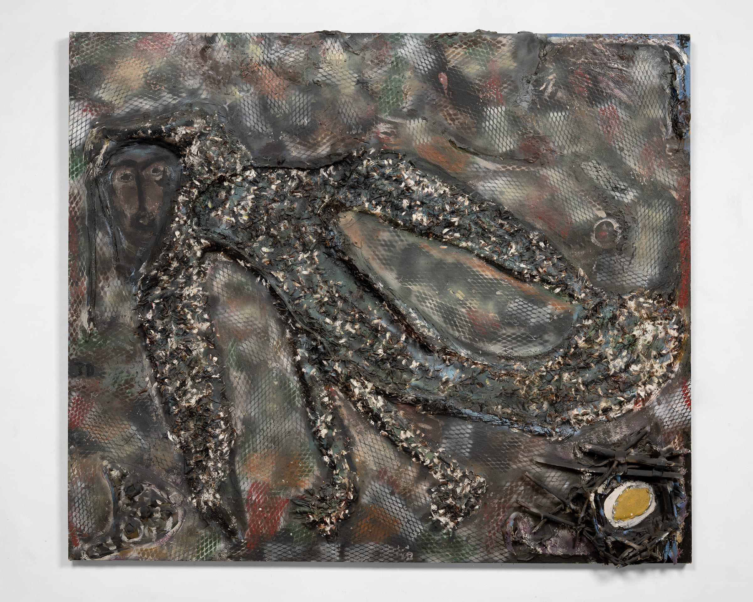 Thornton Dial, Eagle Leaving His Nest, 1998. Pine cones, pine straw, textile, Splash Zone, spray paint, wood, metal wire, enamel on canvas over wood. 172.7 x 203.2 x 7.6 cm, 68 x 80 x 3 in.