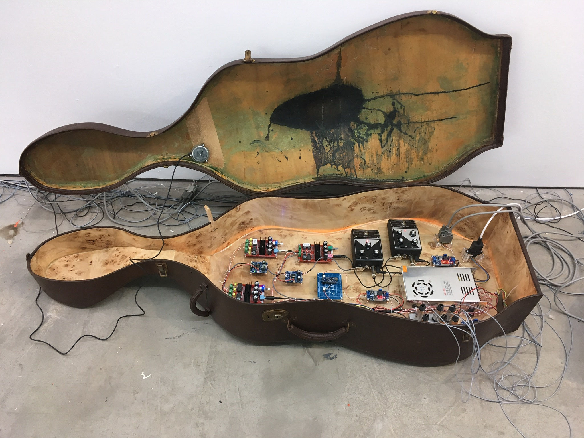 On Tuesday I headed over to Edel Assanti to see Crazy Delay, Harpaz’s first UK solo show. That very evening the gallery was hosting a conversation between the artist herself and Laurence Sillars, Head of Exhibitions at the Henry Moore Foundation. Prior to the talk though we were invited to keep quiet and listen to the story presented in its full loop. After being confronted with apparently disjoined objects we see how each of them is connected through a mechanical sequence. We feel the guitar case reverberating heavily, we listen for a tea cup from which Harpaz’s friend calls for her, a human heartbeat, a prayer. In conversation with Sillars, Harpaz revealed that for the sequence to work it required natural light which proved difficult given the gallery’s location in London.