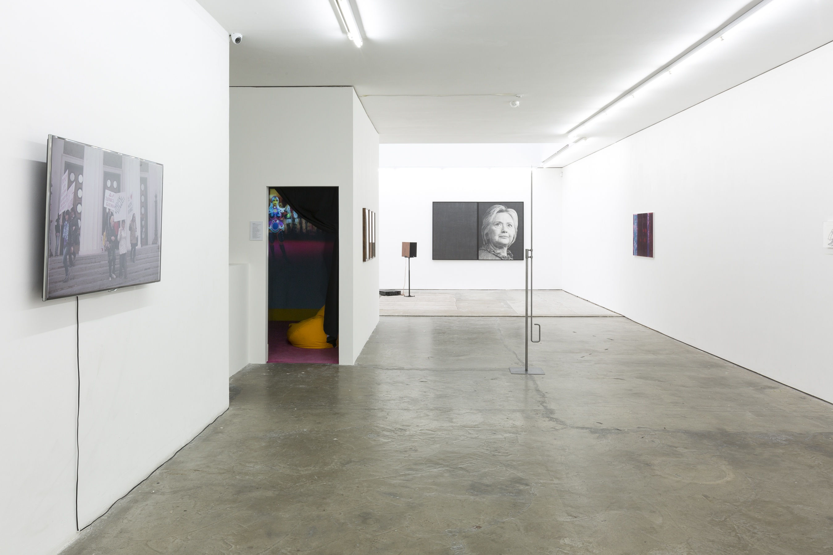 A similar allusion to history is evident in Karl Haendel’s Hillary, 2016, a large diptych portrait of Hillary Clinton, the left panel black, the right a drawing of the former first lady and presidential candidate. The appeal of the depiction chimes with a disarming soundtrack from an adjacent speaker: a pre-schooler giggling her way through a series of male names. Concluding ‘Ron, George, Bill, George, Barry, Donald’, the list runs through the colloquial first names of every US president. The diptych format, common to wedding portraits throughout history (women were usually depicted on the left, the distaff or ‘devil’s side’), yokes Hillary to the absent men who have defined her image. No wonder her lips are pursed in perpetual frustration.