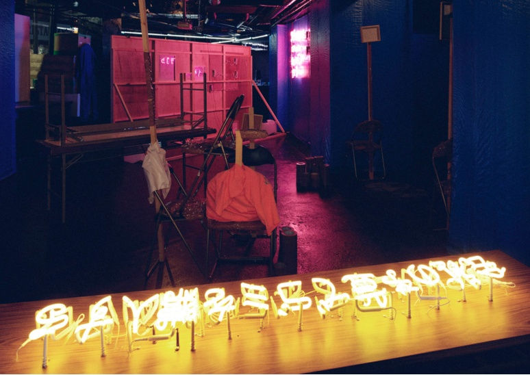 Located amidst the hustle and bustle of Shibuya, the gallery (with a neon sign of the old PARCO PART3 at the entrance) was turned into a temporary space in the style of a barrack, and charged with the disquieting mood of resistance and agitation. In this exhibition, Niwa presents a number of his most representative video works, along with new works incorporating neon signs and mixed media, made in recent years with a special focus on the functions of language itself. “Expecting That the Future That I Am Expecting Is Not Coming” “Purchasing Trash with the Company’s Budget (The War Will Be Announced When It Has Already Begun).” “Unavoidable Work in Order to Keep Us Alive.” Now do these flashy phrases that mistily pop out from the dark represent the artist’s own statements appealing to others or to himself, or are they fragments of provocative quotes from some more or less famous figures? The composition of the exhibition at large with everything being left in limbo is reminiscent of the state of society itself, where decisions are made in groups and things like intention and responsibility are non-existent.