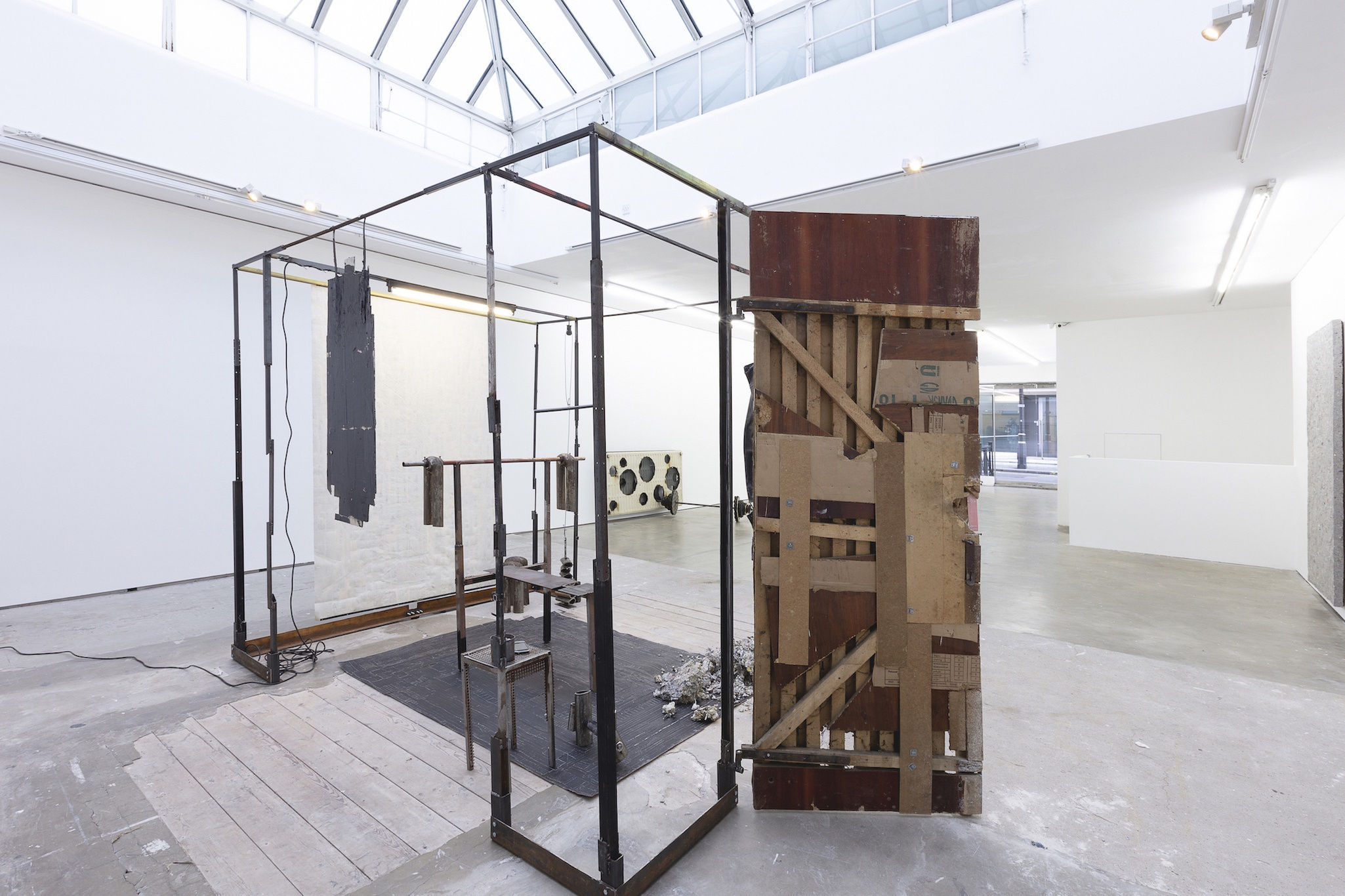 Marcin Dudek, Akumulator, 2018, steel, wood, medical tape, mirror, neon light, iron, paper, leather, silicon and cell phone, 290 x 220 x 220 cm, installation view at Edel Assanti, London, 2019