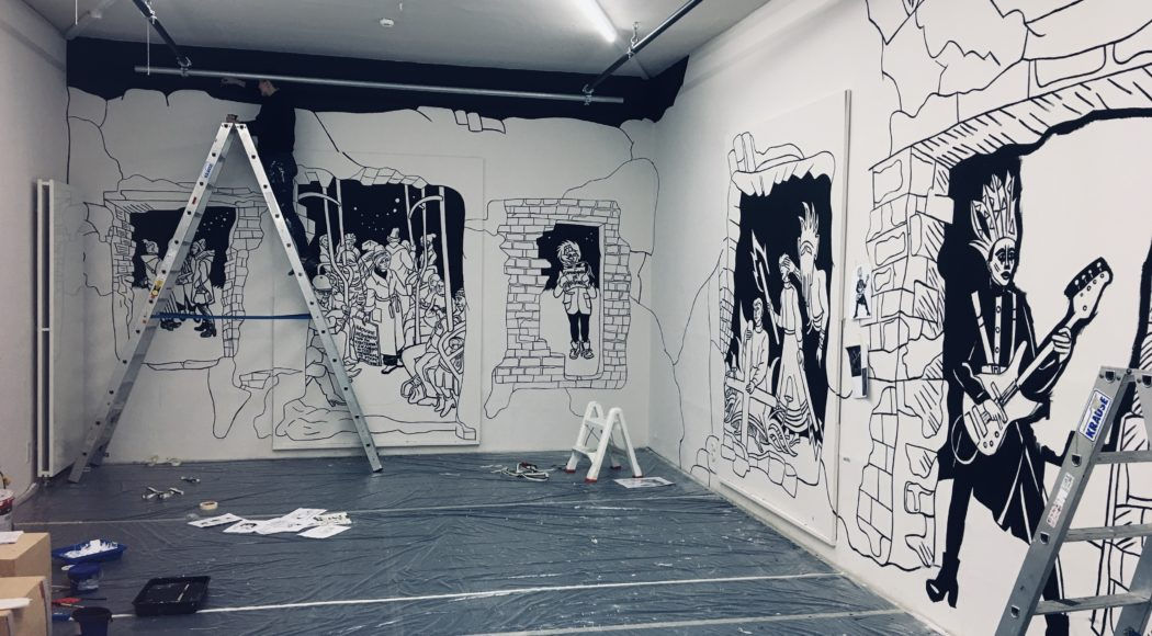Victoria Lomasko, installing 'Act 1' at the Karussell festival, Hellerau, European Centre for the Arts, Dresden, Germany, 2020.