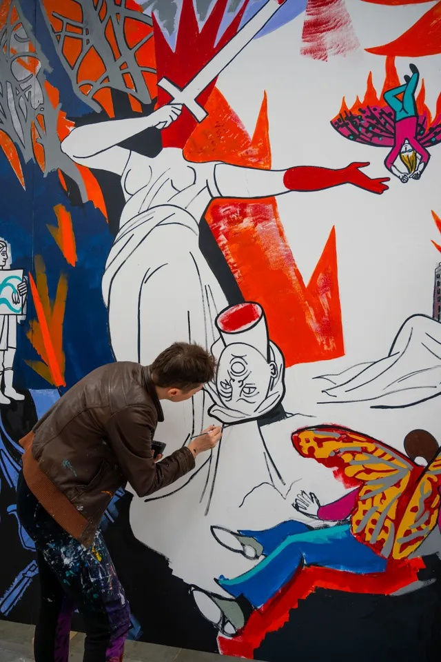Victoria Lomasko at work on her monumental painting 'The Changing of Seasons' in GC Nekkersdal. © Ivan Put