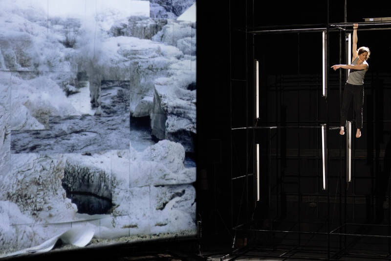The Anima performance draws on Post Atlantica, its body of images and films guided by paleoclimatology (the study of ancient climates). The photographer is fascinated by this science, by the fossil flora and fauna, the charred forests under the ice caps or the astonishing geological links between Brittany and Texas… So many clues that she would like to transcribe conceptually in her images… “I want to look at the landscape from many different angles. Looking at it from the prism of its extremely long history is magical. Seeing the world as a moving entity, as scientists do, has opened doors for me” This is why in her show, the visual artist collides the long time of the earth with the short time of man, embodied on stage by the circus artist Chloé Moglia: "What can better embody the intensity of present than a person suspended in the void?”